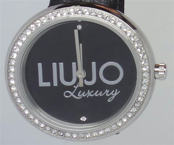 OROLOGIO SOLO TEMPO DONNA, CASSA IN ACCIAIO CON ZIRCONI SULLA GHIERA. QUADRANTE NERO CON PICCOLI ZIRCONI A ORE 12 E 6. CINTURINO IN VERE PELLE NERO OPACO.