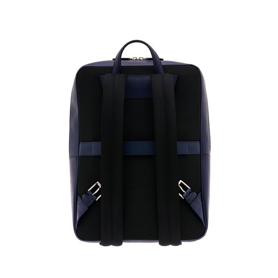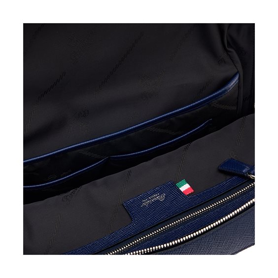 Zaino slim in pelle di vitello stampa saffiano dark blue, firmato Pineider, caratterizzato da un design elegante e raffinato. Presenta una finitura di alta qualità, con dettagli curati e una struttura funzionale che include scomparti interni organizzati per dispositivi tecnologici e altri oggetti essenziali. Le cerniere e gli accessori in metallo aggiungono un tocco di classe, mentre gli spallacci regolabili assicurano comfort durante l'uso quotidiano. Ideale per chi cerca uno stile sofisticato e pratico.