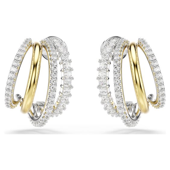 Questi orecchini Hyperbola dagli intricati dettagli trovano bellezza e armonia nei contrasti. Su ciascun lato, i quattro mini cerchi presentano una varietà di finiture del metallo, tra cui le placcature color oro e rodio, e presentano Swarovski Zirconia taglio Round e Square con montatura a griffe. Abbinali ad un bangle o ad una collana coordinati per intensificare il look. Immagini a scopo illustrativo.