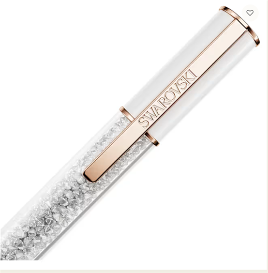 La penna a sfera Crystalline Lustre combina creatività e lusso. Questo distintivo strumento per la scrittura presenta un fusto rotondo bianco e dettagli placcati color oro rosa che includono una pratica clip con inciso il nome Swarovski. Al suo centro, questo accattivante design è illuminato da circa 480 luccicanti cristalli, ciascuno meticolosamente aggiunto utilizzando l’iconica tecnica Crystalline. Una straordinaria aggiunta alla tua scrivania o una notevole idea regalo per gli scrittori della tua vita. I refill di inchiostro nero e blu sono disponibili per l’acquisto negli Swarovski store. Articolo nr.: 5694174 Collezione: Crystalline Lustre Dimensione: 14.4 x 1.1 cm Materiale: Cristalli, Laccato bianco, Placcato color oro rosa Colore: Bianco Colore dell’inchiostro: Nero